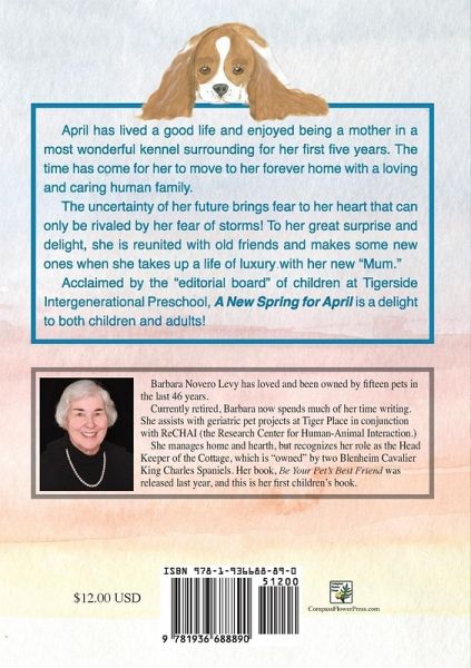 April has lived a good life and enjoyed being a mother in a most wonderful kennel surrounding for her first five years. The time has come for her to move to her forever home with a loving and caring human family. The uncertainty of her future brings fear to her heart that can only be rivaled by her fear of storms! To her great surprise and delight, she is reunited with old friends and makes some new ones when she takes up a life of luxury with her new "Mum." Acclaimed by the "editorial board" of children at Tigerside Intergenerational Preschool, A New Spring for April is a delight to both children and adults!