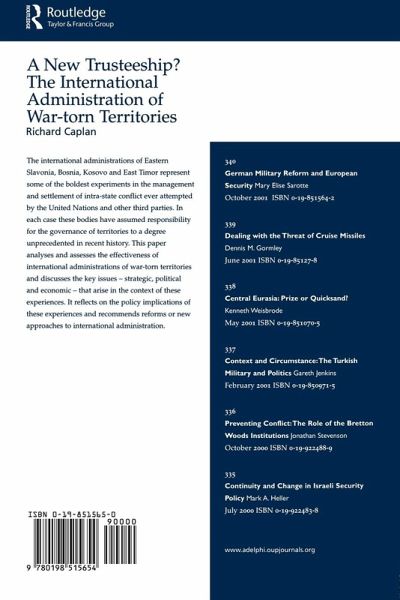 The first study to appear on the international administrations of Bosnia, Eastern Salvonia (Croatia), Kosovo and East Timor. It is a major contribution to the literature on international organisations and conflict management, with particular regard to failed states and contested territories.
