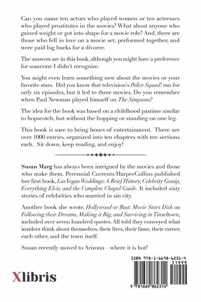 Can you name ten actors who played women or ten actresses who played prostitutes in the movies? What about anyone who gained weight or got into shape for a movie role? And, there are those who fell in love on a movie set, performed together, and were paid big bucks for a divorce. The answers are in this book, although you might have a preference for someone I didn¿t recognize. You might even learn something new about the movies or your favorite stars. Did you know that television¿s Police Squad! ran for only six episodes, but it led to three movies. Do you remember when Paul Newman played himself on The Simpsons? The idea for the book was based on a childhood pastime similar to hopscotch, but without the hopping or standing on one leg. This book is sure to bring hours of entertainment. There are over 1000 entries, organized into ten chapters with ten sections each. Sit down, keep reading, and enjoy!