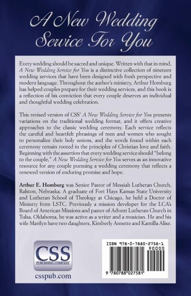 Every wedding should be sacred and unique. Written with that in mind, A New Wedding Service for You is a distinctive collection of nineteen wedding services that have been designed with fresh perspective and modern language. Throughout the author's ministry, Arthur Homburg has helped couples prepare for their wedding services, and this book is a reflection of his conviction that every couple deserves an individual and thoughtful wedding celebration. This revised version of CSS' A New Wedding Service for You presents variations on the traditional wedding format, and it offers creative approaches to the classic wedding ceremony. Each service reflects the careful and heartfelt phrasings of men and women who sought to personalize their holy unions, and the words found within each ceremony remain rooted in the principles of Christian love and faith. Beginning with the assertion that every wedding service should "belong to the couple," A New Wedding Service for You serves as an innovative resource for any couple pursuing a wedding ceremony that reflects a renewed version of enduring promise and hope. Arthur E. Homburg was Senior Pastor of Messiah Lutheran Church, Ralston, Nebraska. A graduate of Fort Hays Kansas State University and Lutheran School of Theology at Chicago, he held a Doctor of Ministry from LSTC. Previously a mission developer for the LCA's Board of American Missions and pastor of Advent Lutheran Church, Tulsa, Oklahoma, he was active as a writer and a musician. He and his wife Marilyn have two daughters, Kimberly Annette and Kamilla Alise.