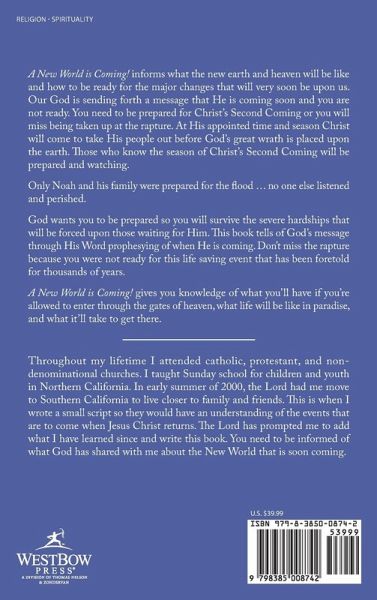 A New World is Coming! informs what the new earth and heaven will be like and how to be ready for the major changes that will very soon be upon us. Our God is sending forth a message that He is coming soon and you are not ready. You need to be prepared for Christ's Second Coming or you will miss being taken up at the rapture. At His appointed time and season Christ will come to take His people out before God's great wrath is placed upon the earth. Those who know the season of Christ's Second Coming will be prepared and watching. Only Noah and his family were prepared for the flood ... no one else listened and perished. God wants you to be prepared so you will survive the severe hardships that will be forced upon those waiting for Him. This book tells of God's message through His Word prophesying of when He is coming. Don't miss the rapture because you were not ready for this life saving event that has been foretold for thousands of years. A New World is Coming! gives you knowledge of what you'll have if you're allowed to enter through the gates of heaven, what life will be like in paradise, and what it'll take to get there.