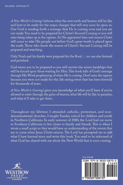 A New World is Coming! informs what the new earth and heaven will be like and how to be ready for the major changes that will very soon be upon us. Our God is sending forth a message that He is coming soon and you are not ready. You need to be prepared for Christ's Second Coming or you will miss being taken up at the rapture. At His appointed time and season Christ will come to take His people out before God's great wrath is placed upon the earth. Those who know the season of Christ's Second Coming will be prepared and watching. Only Noah and his family were prepared for the flood ... no one else listened and perished. God wants you to be prepared so you will survive the severe hardships that will be forced upon those waiting for Him. This book tells of God's message through His Word prophesying of when He is coming. Don't miss the rapture because you were not ready for this life saving event that has been foretold for thousands of years. A New World is Coming! gives you knowledge of what you'll have if you're allowed to enter through the gates of heaven, what life will be like in paradise, and what it'll take to get there.