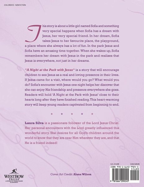 This story is about a little girl named Sofia and something very special happens when Sofia has a dream with Jesus, her very special friend. In her dream, Sofia takes Jesus to her favourite place, the playground, a place where she always has a lot of fun. In the park Jesus and Sofia have an amazing time together. When she wakes up, Sofia remembers her dream with Jesus in the park and realizes that Jesus is everywhere, not just in her dreams. "A Night at the Park with Jesus" is a story that will encourage children to see Jesus as a real and loving presence in their lives. If Jesus came for a visit, where would you go? What would you do? Sofia's encounter with Jesus one night helps her discover that she can enjoy His friendship and presence everywhere she goes. Readers will hold 'A Night at the Park with Jesus' close to their hearts long after they have finished reading. This heart-warming story will keep young readers captivated from beginning to end.