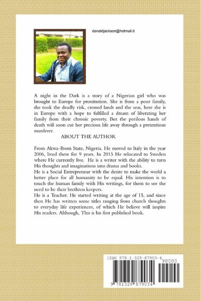 A night in the Dark is a story of a Nigerian girl who was brought to Europe for prostitution. She is from a poor family, she took the deadly risk, crossed lands and the seas,here she is in Europe with a hope to fulfilled a dream of liberating her family from their chronic poverty. But the perilous hands of death will soon cut her precious life away through a pretentious murderer.