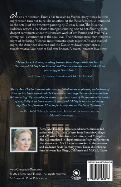 As an art historian, Emma has traveled to Vienna many times before, but this night would turn out to be unlike any other. At the Belvedere, while immersed in the details of the evocative painting known as The Kiss, she suddenly notices a handsome stranger standing next to her. Sharing their deepest sentiments about this timeless work of art, Emma and Poul feel a strong pull, a connection at the soul level. Their chance encounter initiates a night of exploring Vienna's most romantic spots together, from the nature paths Beethoven once strolled to the lit-up winter street market alive with sights, sounds, and savory delights. In a single magical night, the American divorcee and the Danish widower experience a transformative kind of love neither had ever known before. A sweet, innocent love story that promises it's never too late for true romance, set in the cultural heart of this inviting, centuries-old Austrian city along the Danube. Charming, hopeful, heart-warming.