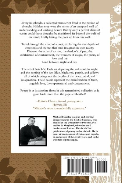 In this book of poetry, you will find poems that will make you experience every possible emotion. Poetry is at its absolute finest in this remembered collection of poems as it gives back much more than the pages embedded. Travel through the mind of a poet, exploring the vast depths of poetry and the ties that bind imagination with reality. Discover the ache of sorrow, the shadow's of past, the exhilaration of contentment, the wonders of magic, the purity of love, and the bond between night and day. The set of Acts I-V: Each act depicting the colors of the night and the coming of the day. Blue, black, red, purple, and yellow; all of which brings out the depths of the heart, mind, and imagination. These colors represent the manifestation of truth, anguish, love, the supernatural, and contentment.