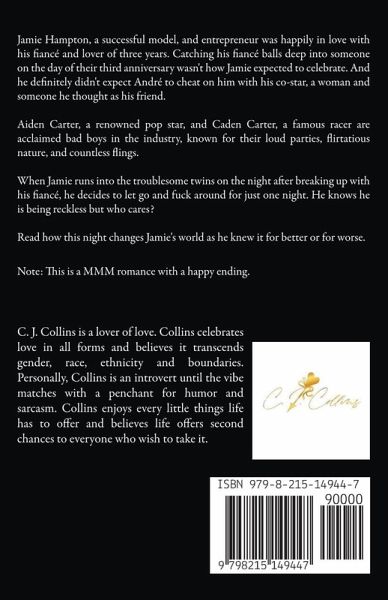 Catching his fiancé balls deep into someone on the day of their third anniversary wasn't how Jamie Hampton expected to celebrate. And he definitely didn't expect André to cheat on him with his co-star, a woman and someone he thought as his friend. *** Jamie Hampton, a successful model, and entrepreneur was happily in love with his fiancé and lover of three years. Catching his fiancé balls deep into someone on the day of their third anniversary wasn't how Jamie expected to celebrate. And he definitely didn't expect André to cheat on him with his co-star, a woman and someone he thought as his friend. Aiden Carter, a renowned pop star, and Caden Carter, a famous racer are acclaimed bad boys in the industry, known for their loud parties, flirtatious nature, and countless flings. When Jamie runs into the troublesome twins on the night after breaking up with his fiancé, he decides to let go and fuck around for just one night. He knows he is being reckless but who cares? Read how this night changes Jamie's world as he knew it for better or for worse. Note: This is a MMM romance with a happy ending.