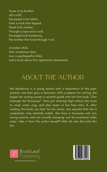 Gone is his brother, off a cliff, Deceased is his father, from a truck that slipped. Dead is his mother, Through a rope and a wall, Deranged and murderous, the brother that lived through it all. A broken child, then murderous teen, now a psychopathic killer, and a book about this nightmare's daydreams.