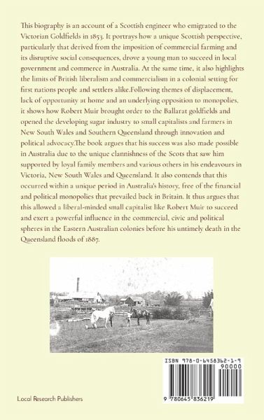 This biography is an account of a Scottish engineer who emigrated to the Victorian Goldfields in 1853. It portrays how a unique Scottish perspective, particularly that derived from the imposition of commercial farming and its disruptive social consequences, drove a young man to succeed in local government and commerce in Australia. At the same time, it also highlights the limits of British liberalism and commercialism in a colonial setting for first nations people and settlers alike. Following themes of displacement, lack of opportunity at home and an underlying opposition to monopolies, it shows how Robert Muir brought order to the Ballarat goldfields and opened the developing sugar industry to small capitalists and farmers in New South Wales and Southern Queensland through innovation and political advocacy. The book argues that his success was also made possible in Australia due to the unique clannishness of the Scots that saw him supported by loyal family members and various others in his endeavours in Victoria, New South Wales and Queensland. It also contends that this occurred within a unique period in Australia's history, free of the financial and political monopolies that prevailed back in Britain. It thus argues that this allowed a liberal-minded small capitalist like Robert Muir to succeed and exert a powerful influence in the commercial, civic and political spheres in the Eastern Australian colonies before his untimely death in the Queensland floods of 1887.