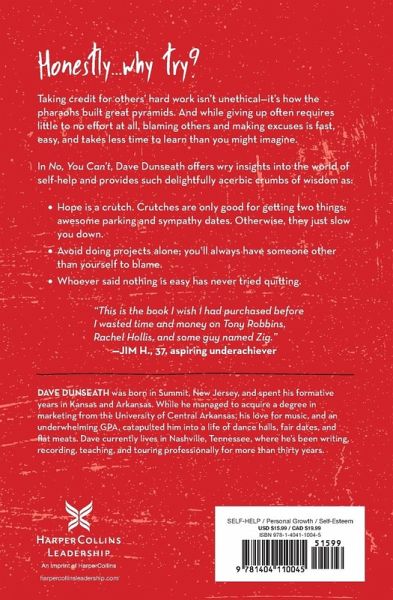 Is it time for you to just give up? Because every time you aim low, you'll feel like you've died and gone to Disneyland. You'll be in a place where you're never concerned about hard work, a place where you never feel guilty for goofing off all day, a place where nobody expects anything from you, a place where choosing to eat a third corn dog--or not--will be the hardest decision of your day. No, You Can't also offers such crumbs of wisdom as: Hope is a crutch. Crutches are only good for getting two things: awesome parking at the mall and sympathy dates. Otherwise, they will just slow you down. You can't be a failure when you have no hope of winning. Whoever said nothing is easy has never tried quitting. Aiming low is as easy as breathing. You can practically do it without thinking. And the skills required to get there--like quitting and making excuses--take less time to learn than you might imagine. All you need is No, You Can't and the stark realization that you don't really want to "be all that you can be." In fact, your expectations can go so low that anything you DO achieve is completely surprising.