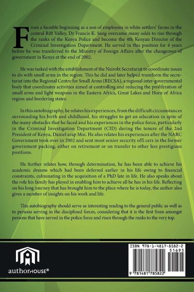 From a humble beginning as a son of employees in white settlers' farms in the central Rift Valley, Dr Francis K. Sang overcame many odds to rise through the ranks of the Kenya Police and become the 4th Kenyan Director of the Criminal Investigation Department. He served in this position for 4 years before he was transferred to the Ministry of Foreign Affairs after the changeover of government in Kenya at the end of 2002. He was tasked with the establishment of the Nairobi Secretariat to coordinate issues to do with small arms in the region. This he did and later helped transform the secretariat into the Regional Centre for Small Arms (RECSA), a regional inter-governmental body that coordinates activities aimed at controlling and reducing the proliferation of small arms and light weapons in the Eastern Africa, Great Lakes and Horn of Africa region and bordering states. In this autobiography, he relates his experiences, from the difficult circumstances surrounding his birth and childhood, his struggles to get an education in spite of the many obstacles that he faced and his experiences in the police force, particularly in the Criminal Investigation Department (CID) during the tenure of the 2nd President of Kenya, Daniel arap Moi. He also relates his experiences after the NARC Government took over in 2002 and sent most senior security offi cers in the former government packing, either on retirement or on transfer to other less prestigious positions. He further relates how, through determination, he has been able to achieve his academic dreams which had been deferred earlier in his life owing to financial constraints, culminating in the acquisition of a PhD late in life. He also speaks about the role his family has played in enabling him to achieve all he has in his life. Reflecting on his long journey that has brought him to the place where he is today, the author also gives a number of insights on his work and life. This autobiography should serve as interesting reading to the general public as well as to persons serving in the disciplined forces, considering that it is the first from amongst persons that have served in the police force and risen through the ranks to the very top.