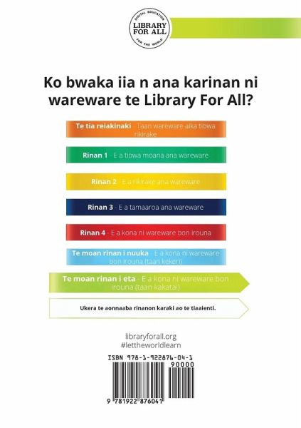 Wiwii and her younger brother named Tenten woke up early to go for a swim. They used to swim in the sea only, back on their island, but this time they're going for a swim in the river for the first time. A rangi n utimwaaka Wiwii ma mwaanena ae Tenten bwa ana katauraoia i mwaain te uaua. A taneiai n uaua i taari i abaia, ma n tai aioo, a nang nako n uaua n te karaanga ao ai bon tibwa aia moan tai naba n uaua n te karaanga. Your purchase of this book supports Library For All in its mission to make knowledge available to all, equally.