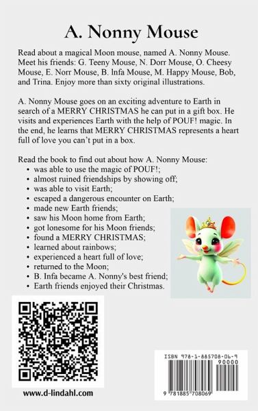 Read about a magical Moon mouse, named A. Nonny Mouse. Meet his friends: G. Teeny Mouse, N. Dorr Mouse, O. Cheesy Mouse, E. Norr Mouse, B. lnfa Mouse, M. Happy Mouse, Bob, and Trina. Enjoy more than sixty original illustrations. A. Nonny Mouse goes on an exciting adventure to Earth in search of a MERRY CHRISTMAS he can put in a gift box. He visits and experiences Earth with the help of POUF! magic. In the end, he learns that MERRY CHRISTMAS represents a heart full of love you can't put in a box. Read the book to find out about how A. Nonny Mouse:was able to use the magic of POUF!; watched a Space TV; almost ruined friendships by showing off; was able to visit Earth; escaped a dangerous encounter on Earth; made new Earth friends; saw his Moon home from Earth; got lonesome for his Moon friends; found a MERRY CHRISTMAS; learned about rainbows; experienced a heart full of love; returned to the Moon; became best friend with B. Infa; and Earth friends enjoyed their Christmas.