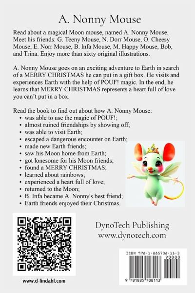 Read about a magical Moon mouse, named A. Nonny Mouse. Meet his friends: G. Teeny Mouse, N. Dorr Mouse, O. Cheesy Mouse, E. Norr Mouse, B. lnfa Mouse, M. Happy Mouse, Bob, and Trina. Enjoy more than sixty original illustrations. A. Nonny Mouse goes on an exciting adventure to Earth in search of a MERRY CHRISTMAS he can put in a gift box. He visits and experiences Earth with the help of POUF! magic. In the end, he learns that MERRY CHRISTMAS represents a heart full of love you can't put in a box. Read the book to find out about how A. Nonny Mouse: was able to use the magic of POUF!; watched a Space TV; almost ruined friendships by showing off; was able to visit Earth; escaped a dangerous encounter on Earth; made new Earth friends; saw his Moon home from Earth; got lonesome for his Moon friends; found a MERRY CHRISTMAS; learned about rainbows; experienced a heart full of love; returned to the Moon; became best friend with B. Infa; and Earth friends enjoyed their Christmas.