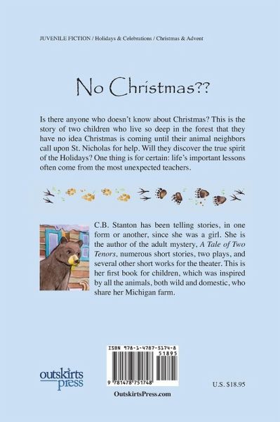 No Christmas?? Is there anyone who doesn't know about Christmas? This is the story of two children who live so deep in the forest that they have no idea Christmas is coming until their animal neighbors call upon St. Nicholas for help. Will they discover the true spirit of the Holidays? One thing is for certain: life's important lessons often come from the most unexpected teachers.