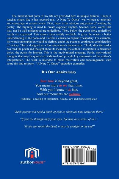 The motivational parts of my life are provided here in unique fashion. I hope it touches others like it has touched me. "A Note To Quote" was written to entertain and encourage at several levels. First, there is the obvious enjoyment of reading the poetry. The rhyming is used to create expected rhythm. Second, some words that may not be well understood are underlined. Then, below the poem these underlined words are explained. This makes them readily available. This gives the reader a better understanding of the poem and it offers a chance to expand vocabulary. For example, the word…mehr