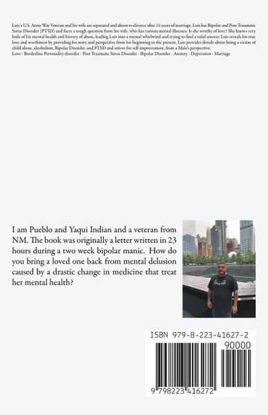I am Pueblo and Yaqui Indian and a veteran from NM. I have Bipolar and Post Traumatic Stress Disorder (PTSD) and face a tough question from my wife, who has Borderline Personality Disorder (BPD), PTSD and other related mental conditions. At the time my wife was suffering from a severe identity crisis and wants a divorce and to runaway. She asks me, is she is she worthy of love? She knows very little of my mental health and history of abuse, leading me into a mental whirlwind of countless thoughts and emotions. The book was originally a letter written in 23 hours during a two week bipolar manic. How do you bring a loved one back from mental delusion caused by a drastic change in medicine that treat her mental health? I reflect on how we men are raised to "Be a man" and figure things out. We are told at a young age "Figure it out, your gonna be a man soon" and other phrases as boys. What happens when we don't have it figured out? "Being a man" means our mental health is a low priority and it reflects in all our relationships. Read how my mind turmoils and tells the story of my past to save our marriage. Much like the notebook, I race to tell my story and ours to bring her back from delusion from the borderline.