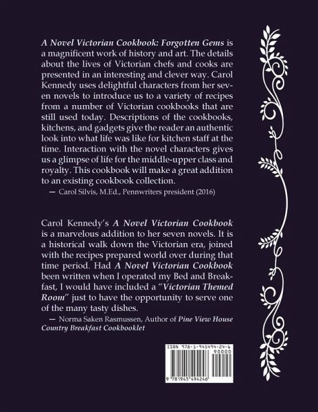 This cookbook is many things rolled into one, but four themes stand out: forgotten gems, a gathering of time travellers, culture appreciation, and sheer joy. There are cooks among us who would like to please an audience with a dish that they haven't had before, and that is surprisingly tasty. For that purpose, an excellent place to look for ideas is among the classic dishes of another century. It is time for some of those forgotten gems to roll around as "new." This cookbook grew out of research for my seven historical novels, Winthrope, Poppy, The Arrangement, Bobbin's Journal, The Spinster, Sophie & Juliet, and Holybourne. The characters in those novels have very definite preferences and favourite dishes. To create a narrative for this cookbook, about two dozen characters are brought to the same table to describe what they like. There are over 325 recipes for their favourite dishes that are included in the back two-thirds of this book. Note that the characters did not live contemporaneously, but are brought together anyway, as a gathering of time travellers, to compare notes. It is well recognised that our culinary history is a very important part of our culture. This cookbook is a contribution to our culture appreciation, awareness, and preservation. Recipes presented here are fully authentic from the period, complete with the old original spelling and phrasing. Sheer joy. There is a great deal of fun and good-natured humour to be had by comparing the way we think, speak, and eat to our ancestors of the 18th and 19th centuries. Yes, much of it is laughable, but don't be surprised to occasionally catch an insight from the past that is fully apropos to the present. This is a beautiful Coffee-Table cookbook to be cherished and passed down like the "forgotten gems" inside. It is quite unique and different from the typical cookbook-nothing else of its type is in existence. Along with delicious recipes, there is gossip and folklore of the day. Proper English etiquette is followed. Recipes were chosen from culturally important cookbooks written by Farley, Raffald, Mason, Johnstone (aka) Meg Dods, Jarrin, Acton and Beeton, to name a few. Also included are brief biographies of chefs Marie-Antoine Carême, Charles Elmé Francatelli, Alexis Soyer, and Auguste Escoffier. The categories of recipes are varied, diverse, and encompass an entire array of food choices regularly available in those times. They include sections dedicated to Soup, Breads & Rolls, Poultry & Feathered Game, Meats & Furred Game, Hors d'oeuvres, Beverages, Cakes & Desserts, Seafood & Fresh Water Fish, Vegetables, Preserves, Spices & Seasonings, Sauces, and lastly Butter, Milk & Eggs. There are never-before-published paintings by the author; over 200 pictures of food dishes and meals as well as meal planning and unusual and humorous kitchen lore. Included is a unique chapter on "contributory recipes" from the author's friends whose relatives passed on their cherished recipes from Victoria's England. The author has included a brief history of her friends as they share remarkable and loving stories from those long-departed relatives. A detailed index to help you quickly locate what you're looking for along with terms to help you navigate those tricky French cooking terms.