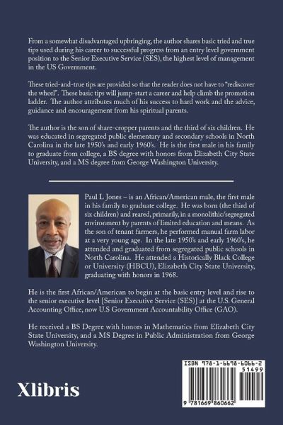 From a somewhat disadvantaged upbringing, the author shares basic tried and true tips used during his career to successful progress from an entry level government position to the Senior Executive Service (SES), the highest level of management in the US Government. These tried-and-true tips are provided so that the reader does not have to "rediscover the wheel". These basic tips will jump-start a career and help climb the promotion ladder. The author attributes much of his success to hard work and the advice, guidance and encouragement from his spiritual parents. The author is the son of share-cropper parents and the third of six children. He was educated in segregated public elementary and secondary schools in North Carolina in the late 1950's and early 1960's. He is the first male in his family to graduate from college, a BS degree with honors from Elizabeth City State University, and a MS degree from George Washington University.