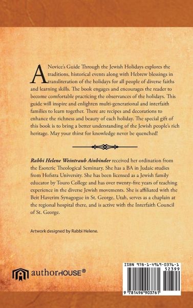 A Novice's Guide Through the Jewish Holidays explores the traditions, historical events along with Hebrew blessings in transliteration of the holidays for all people of diverse faiths and learning skills. The book engages and encourages the reader to become comfortable practicing the observances of the holidays. This guide will inspire and enlighten multi-generational and interfaith families to learn together. There are recipes and decorations to enhance the richness and beauty of each holiday. The special gift of this book is to bring a better understanding of the Jewish people's rich heritage. May your thirst for knowledge never be quenched!…mehr