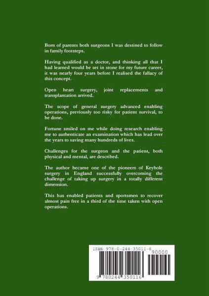 Born of parents both surgeons I was destined to follow in family footsteps. Having qualified as a doctor, and thinking all that I had learned would be set in stone for my future career, it was nearly four years before I realised the fallacy of this concept. Open heart surgery, joint replacements and transplantation arrived. The scope of general surgery advanced enabling operations, previously too risky for patient survival, to be done. Fortune smiled on me while doing research enabling me to authenticate an examination which has led over the years to saving many hundreds of lives. Challenges for the surgeon and the patient, both physical and mental, are described. The author became one of the pioneers of Keyhole surgery in England successfully overcoming the challenge of taking up surgery in a totally different dimension. This has enabled patients and sportsmen to recover almost pain free in a third of the time taken with open operations.