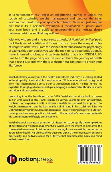 In "A Nutritionist in You", begin an enlightening journey to unlock the secrets of sustainable weight management and discover the inner wisdom that transforms your approach to health. This is not just another diet book; it's a personal revolution, a reclamation of power over your own body, and a guide to understanding the intricate dance between nutrition and lifelong wellness. With wit, wisdom, and a no-nonsense attitude, "A Nutritionist in You" peels back the layers of fad diets and fitness myths to reveal the core principles of weight loss that lasts. From the science of metabolism to the psychology of eating, this book equips you with the tools to read your body's signals, make informed choices, and cultivate habits that stick FOREVER. It's time to turn the page on quick fixes and embrace the journey of health that doesn't just end with the last chapter but continues to enrich your life, forever.