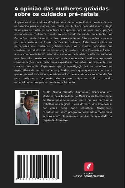 A gravidez é uma altura difícil na vida de uma mulher e precisa de ser esclarecida para a maioria das mulheres. A clínica pré-natal é um refúgio fiável para as mulheres encontrarem respostas para as suas preocupações e sentirem-se confiantes quanto ao seu estado de saúde. No entanto, nos Camarões, ainda há muito a fazer para ajudar as futuras mães a passar por este estado de forma pacífica e confiante. Este livro explora as percepções das mulheres grávidas sobre os cuidados pré-natais que recebem num distrito de saúde na região sudoeste dos Camarões. Explora a sua compreensão do valor dos cuidados pré-natais, avalia os cuidados que lhes são prestados em centros de saúde selecionados e apresenta recomendações para melhorar a experiência das mães que frequentam as clínicas pré-natais. Esperamos que a investigação vá ao encontro das expectativas de outras mulheres grávidas, onde quer que se encontrem, e que o pessoal de saúde que leia este livro leve a sério as recomendações para melhorar o bem-estar das nossas mães em todo o mundo, especialmente nos países em desenvolvimento.