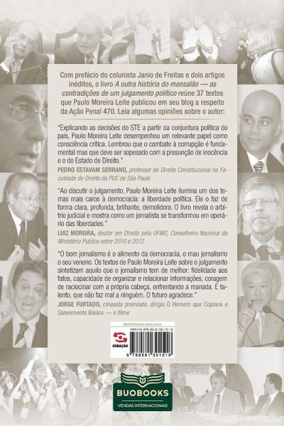 Com prefácio do colunista Janio de Freitas e dois artigos inéditos, o livro "A outra história do mensalão ¿ as contradições de um julgamento político" reúne 37 textos que Paulo Moreira Leite publicou em seu blog a respeito da Ação Penal 470. Leia algumas opiniões sobre o autor: ¿Explicando as decisões do STE a partir da conjuntura política do país, Paulo Moreira Leite desempenhou um relevante papel como consciência crítica. Lembrou que o combate à corrupção é fundamental mas que deve ser sopesado com a presunção de inocência e o do Estado de Direito.¿ - PEDRO ESTAVAM SERRANO, professor de Direito Constitucional na Faculdade de Direito da PUC de São Paulo ¿Ao discutir o julgamento, Paulo Moreira Leite ilumina um dos temas mais caros à democracia: a liberdade política. Ele o faz de forma clara, profunda, brilhante, demolidora. O livro revela o arbítrio judicial e mostra como um jornalista se transformou em operário das liberdades.¿ - LUIZ MOREIRA, doutor em Direito pela UFMG, Conselheiro Nacional do Ministério Publico entre 2010 e 2012 ¿O bom jornalismo é o alimento da democracia, o mau jornalismo o seu veneno. Os textos de Paulo Moreira Leite sobre o julgamento sintetizam aquilo que o jornalismo tem de melhor: fidelidade aos fatos, capacidade de organizar e relacionar informações, coragem de raciocinar com a própria cabeça, enfrentando a manada. E talento, que não faz mal a ninguém. O futuro agradece.¿ - JORGE FURTADO, cineasta premiado, dirigiu O Homem que Copiava e Saneamento Básico ¿ o filme.