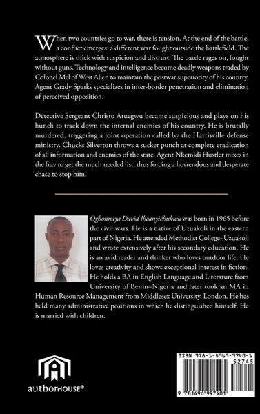 When two countries go to war, there is tension. At the end of the battle, a conflict emerges: a different war fought outside the battlefield. The atmosphere is thick with suspicion and distrust. The battle rages on, fought without guns. Technology and intelligence become deadly weapons traded by Colonel Mel of West Allen to maintain the postwar superiority of his country. Agent Grady Sparks specializes in inter-border penetration and elimination of perceived opposition. Detective Sergeant Christo Atuegwu became suspicious and plays on his hunch to track down the internal enemies of his country. He is brutally murdered, triggering a joint operation called by the Harrisville defense ministry. Chucks Silverton throws a sucker punch at complete eradication of all information and enemies of the state. Agent Nkemidi Hustler mixes in the fray to get the much needed list, thus forcing a horrendous and desperate chase to stop him.