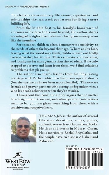 This book is about ordinary life events, experiences, and relationships that can teach you lessons for living a more fulfilling life. From the Middle East to his family's hometown of Chennai in Eastern India and beyond, the author shares meaningful insights from what-at first glance-may seem like the mundane. For instance, children often demonstrate sensitivity to the needs of others far beyond their age. Where adults hide, fearing what the world may think, children reach out boldly to do what they feel is right. Their expressions of love, trust, and loyalty are far more genuine than that of adults. If we only stopped to observe and learn from them, we'd find solutions to problems that plague us. The author also shares lessons from his long-lasting marriage with Rachel, which has had many ups and downs (but the ups have always been more plentiful). The two are friends and prayer partners with strong, independent views who love each other even when they're at odds. Throughout this book, the author argues that no matter how insignificant, transient, and ordinary certain interactions seem to be, you can glean something from them with a sensitive and receptive heart.