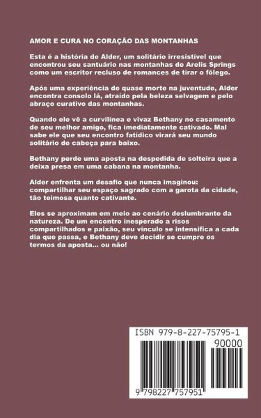 AMOR E CURA NO CORAÇÃO DAS MONTANHAS Esta é a história de Alder, um solitário irresistível que encontrou seu santuário nas montanhas de Arelis Springs como um escritor recluso de romances de tirar o fôlego. Após uma experiência de quase morte na juventude, Alder encontra consolo lá, atraído pela beleza selvagem e pelo abraço curativo das montanhas. Quando ele vê a curvilínea e vivaz Bethany no casamento de seu melhor amigo, fica imediatamente cativado. Mal sabe ele que seu encontro fatídico virará seu mundo solitário de cabeça para baixo. Bethany perde uma aposta na despedida de solteira que a deixa presa em uma cabana na montanha. Alder enfrenta um desafio que nunca imaginou: compartilhar seu espaço sagrado com a garota da cidade, tão teimosa quanto cativante. Eles se aproximam em meio ao cenário deslumbrante da natureza. De um encontro inesperado a risos compartilhados e paixão, seu vínculo se intensifica a cada dia que passa, e Bethany deve decidir se cumpre os termos da aposta... ou não!