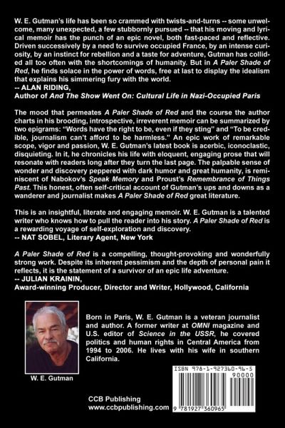An epic work of remarkable scope, vigor and passion, W. E. Gutman's latest book is acerbic, iconoclastic and disquieting. In this memoir, he chronicles his life with eloquent, engaging prose that will resonate with readers long after they turn the last page. The palpable sense of wonder and discovery peppered with dark humor and great humanity, is reminiscent of Nabokov's Speak Memory and Proust's Remembrance of Things Past. This honest, often self-critical account of the author's ups and downs as a wanderer and journalist makes A Paler Shade of Red great literature. About the Author: Born in Paris, W. E. Gutman is a veteran journalist and author. A former writer at OMNI magazine and U.S. editor of Science in the USSR, he covered politics and human rights in Central America from 1994 to 2006. He lives with his wife in southern California.