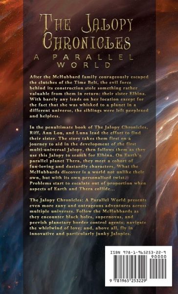 After the McHubbard family courageously escaped the clutches of the Time Belt, the evil force behind its construction stole something rather valuable from them in return: their sister Elbina. With barely any leads on her location except for the fact that she was whisked to a planet in a different universe, the siblings were left perplexed and helpless. In the penultimate book of The Jalopy Chronicles, Riff, Ann Lou, and Luna lead the effort to find their sister. The story takes them first on a journey to aid in the development of the first multi-universal Jalopy, then follows them as they use this Jalopy to search for Elbina. On Earth's parallel planet Thera, they meet a cohort of fun-loving and dastardly characters. What the McHubbards discover is a world not unlike their own, but with its own personalised twist. Problems start to escalate out of proportion when aspects of Earth and Thera collide... The Jalopy Chronicles: A Parallel World presents even more zany and outrageous adventures across multiple universes. Follow the McHubbards as they encounter black holes, supernovas, and peevish planetary border control agents; navigate the whirlwind of love; and, above all, fly in innovative and particularly junky Jalopies.