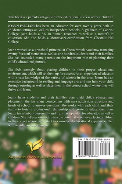 This book is a parents self-guide for the educational success of their children. _____________________________________________ Joann Falciani has been an educator for over twenty years both in childcare settings as well as independent schools. A graduate of Cabrini College, Joan holds a B.S. in human resources as well as a master's in education. She also holds a Montessori certification from Chestnut Hill College. Joann worked as a preschool principal at Chesterbrook Academy, managing twenty-five staff members as well as one hundred students and their families. She has counseled many parents on the important role of planning their child's educational journey. She feels strongly about placing children in their proper educational environment, which will set them up for success. As an experienced educator with a vast knowledge of the variety of schools in the area, Joann has an extensive background in reading and language arts and can help your child through tutoring as well as place them in the correct school where they will thrive and learn.