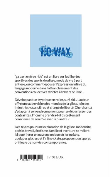 "ça part en free ride" est un livre sur les libertés sportives des sports de glisse, mode de vie à part entière, ou comment épouser l'expression infinie du langage moderne dans l'affranchissement des conventions collectives strictes. Développant un tryptique en roller, surf, ski... L'auteur offre une autre vision des mondes de la glisse, loin des industries vacancières et chargé de liberté. Cherchant à s'adapter à son environnement pour se débarrasser des contraintes, l'homme prendra-t-il discrètement conscience de son rôle avec la planète ? Des textes pour une exploration de la glisse, modernité, poésie, travail, érotisme, famille et aventure se mêlent ici pour livrer un ouvrage unique où les océans, quelques glaciers et l'inline-skate, proposent un aperçu originale de nos vies contemporaines.