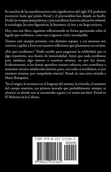 En muchas de las manifestaciones más significativas del siglo XX podemos reconocer hasta qué punto Freud y el psicoanálisis han dejado su huella. Desde las terapias psiquiátricas y psicoanalíticas hasta la educación infantil, la sociología, las artes figurativas, la literatura, el cine y un largo etcétera. Hoy, con este libro, seguimos reflexionando en forma apasionada sobre el legado que recibimos, como una exigencia vital e insoslayable. Tánatos está siempre presente, con distintos ropajes, y esa amenaza nos convoca a apelar a Eros con nuestras reflexiones que plasmamos en escritos. ¿Por qué escribimos? "Nadie escribe para asegurarse la celebridad, que es algo transitorio, una ilusión de inmortalidad. Antes que nada escribimos para satisfacer algo interno a nosotros mismos, no por los demás. Evidentemente, si los demás aprueban nuestro esfuerzo, esto contribuye a aumentar nuestra satisfacción interior, pero, con todo, si escribimos, es por nosotros mismos, por compulsión interna". Freud, en una carta enviada a Marie Bonaparte. "En el origen, la escritura era el lenguaje del ausente, la vivienda, el sustituto del cuerpo materno, esa primera morada que probablemente siempre se añorará, en donde uno se encontraba seguro y se sentía tan bien". Freud en El Malestar en la Cultura.
