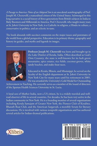 A Passage to America: Notes of an Adopted Son is an anecdotal autobiography of Prof. Joseph M. Cheruvelil, a naturalized citizen of the United States. Submerged in this long narrative is a social history of three generations from British subjects in India to Baby Boomers and Millennials in America. Prof. Cheruvelil, who taught many years at St. John’s University in New York, is a Catholic in religion, a Hindu in culture, a conservative in politics, and an eclectic in taste. The book abounds with succinct comments on the major issues and potentates of the world from a global perspective. Education is its primary theme, geography and history its guides, and myths and legends its images.