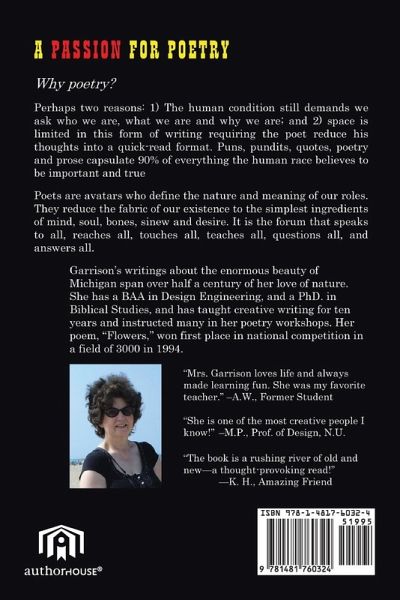 A PASSION FOR POETRY Why poetry? Why has this ancient craft existed throughout time, continuing even into our fast-paced age of moderncy and technology? Perhaps two reasons: 1) The human condition still demands we ask who we are, what we are and why we are; and 2) space is limited in this form of writing requiring the poet reduce his thoughts into a quick-read format. Puns, pundits, quotes, poetry and prose capsulate 90% of everything the human race believes to be important and true Poets are avatars who define the nature and meaning of our roles. They reduce the fabric of our existence to the simplest ingredients of mind, soul, bones, sinew and desire. It is the forum that speaks to all, reaches all, touches all, teaches all, questions all, answers all.