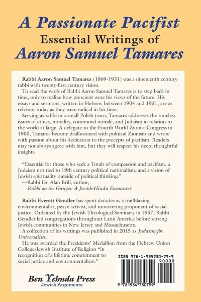 The first English-language translation of the Hebrew essays and sermons of Rabbi Aaron Samuel Tamares (1869-1931). An Orthodox rabbi, he served as a delegate to the Fourth World Zionist Congress in 1900, after which renounced nationalism and embraced pacifism as a central Jewish teaching. Readers may not always agree with him, but they will respect his deep, thoughtful insights. This volume also includes a translation of a lengthy Yiddish-language autobiographical essay Rabbi Tamares wrote toward the end of his life. The essay was translated by Ri J. Turner. Tzemah Yoreh also contributed to the translations in this volume. Rabbi Everett Gendler has been bringing Rabbi Tamares to the attention of English readers for more than 50 years. A trailblazing environmentalist, peace activist, and unwavering proponent of social justice, He was ordained by the Jewish Theological Seminary in 1957. Rabbi Gendler led congregations throughout Latin America before serving Jewish communities in New Jersey and Massachusetts. He served as the first Jewish chaplain at Phillips Academy Andover. He was recently awarded the Presidents’ Medallion from the Hebrew Union College-Jewish Institute of Religion "in recognition of a lifetime commitment to social justice and environmentalism." A collection of his writings was published in 2015 as Judaism for Universalists.