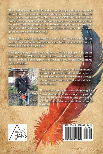 The day that a medium told Don the story of his past life as a boy named Brave Hawk, he thought the whole thing was nonsense. She explained that a Native American Chief by the name of White Cloud had come through to her to tell the story of Bird, a young boy who had stolen from the tribe. Bird was captured and eventually adopted into an Arapaho tribe in South Dakota, sometime in the eighteenth century. There he was given his new name: Brave Hawk.That night, a vivid and powerful dream changed Don's mind. In the dream, his spirit guide, Gonacheaw, came forth and compelled him to write a book about his past life. Bird grew up on a small farm southwest of Lake Michigan. Life on the farm was hard. When Bird was older, his father-in-law and brother decided to build a trading post, this is where he was eventually captured by the Arapaho.Bird soon became a part of their community. Beloved by the chief, Bird was made a part of the tribe and earned his new name through acts of bravery and survival under difficult circumstances.This is the story of his new life among his Native American family, a story of a past life that the author hopes will inspire everyone to open their minds to the miraculous nature of eternity.