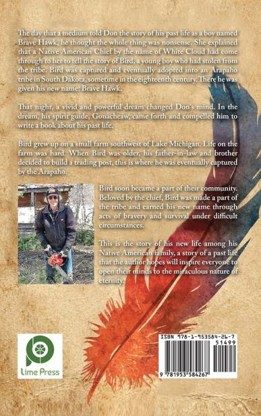 The day that a medium told Don the story of his past life as a boy named Brave Hawk, he thought the whole thing was nonsense. She explained that a Native American Chief by the name of White Cloud had come through to her to tell the story of Bird, a young boy who had stolen from the tribe. Bird was captured and eventually adopted into an Arapaho tribe in South Dakota, sometime in the eighteenth century. There he was given his new name: Brave Hawk.That night, a vivid and powerful dream changed Don's mind. In the dream, his spirit guide, Gonacheaw, came forth and compelled him to write a book about his past life.Bird grew up on a small farm southwest of Lake Michigan. Life on the farm was hard. When Bird was older, his father-in-law and brother decided to build a trading post, this is where he was eventually captured by the Arapaho.Bird soon became a part of their community. Beloved by the chief, Bird was made a part of the tribe and earned his new name through acts of bravery and survival under difficult circumstances.This is the story of his new life among his Native American family, a story of a past life that the author hopes will inspire everyone to open their minds to the miraculous nature of eternity.