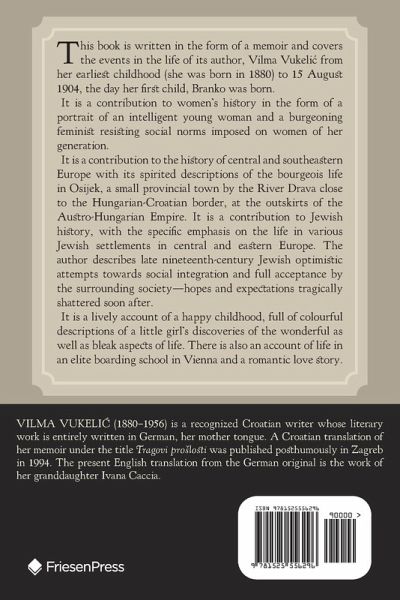 This book is written in the form of a memoir and covers the events in the life of its author, Vilma Vukeli¿ from her earliest childhood (she was born in 1880) to 15 August 1904, the day her first child, Branko was born. It is a contribution to women's history in the form of a portrait of an intelligent young woman and a burgeoning feminist resisting social norms imposed on women of her generation. It is a contribution to the history of central and southeastern Europe with its spirited descriptions of the bourgeois life in Osijek, a small provincial town by the River Drava close to the Hungarian-Croatian border, at the outskirts of the Austro-Hungarian Empire. It is a contribution to Jewish history, with the specific emphasis on the life in various Jewish settlements in central and eastern Europe. The author describes late nineteenth-century Jewish optimistic attempts towards social integration and full acceptance by the surrounding society-hopes and expectations tragically shattered soon after. It is a lively account of a happy childhood, full of colourful descriptions of a little girl's discoveries of the wonderful as well as bleak aspects of life. There is also an account of life in an elite boarding school in Vienna and a romantic love story. www.vilmavukelic.com