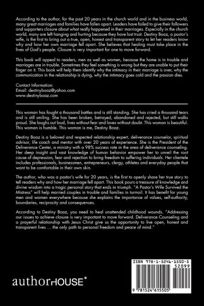 This woman has fought a thousand battles and is still standing. She has cried a thousand tears and is still smiling. She has been broken, betrayed, abandoned and rejected, but still walks proud. She laughs out loud, lives without fear and loves without doubt. This woman is beautiful. This woman is humble. This woman is me, Destiny Boaz. Destiny Boaz is a beloved and respected relationship expert, deliverance counselor, spiritual advisor, life coach and mentor with over 20 years of experience. She is the President of the Deliverance Center, a ministry with a 98% success rate in the area of deliverance counseling. Her deep insight and vast knowledge of human behavior empower her to unveil the root cause of depression, fear and rejection to bring freedom to suffering individuals. Her clientele includes professionals, businessmen, entrepreneurs, clergy, athletes and everyday people that want to be comfortable in their own skin. The author, who was a pastor's wife for 20 years, is the first to openly share her true story to tell readers why and how her marriage fell apart. This book pours a treasure of knowledge and divine wisdom into a tragic personal story that ends in triumph. "A Pastor's Wife Survived the Mistress" will help married couples in trouble and families in turmoil. It has benefit for young men and women everywhere because she explains the importance of values, self-authority, boundaries, reciprocity and consequences. According to Destiny Boaz, you need to heal unattended childhood wounds. "Addressing our issues to achieve closure is very important to move forward. Deliverance Counseling and a prayerful relationship with Jesus Christ give us the opportunity to live open, honest and transparent lives ... the only path to personal freedom and peace of mind."