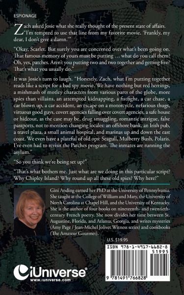 Zach asked Josie what she really thought of the present state of affairs. "I'm tempted to use that line from my favorite movie, 'Frankly, my dear, I don't give a damn.'" "Okay, Scarlet. But surely you are concerned over what's been going on. That famous memory of yours must be putting ... what do you call them? Oh, yes, patches. Aren't you putting two and two together and getting five? That's what you usually do." It was Josie's turn to laugh. "Honestly, Zach, what I'm putting together reads like a script for a bad spy movie. We have nothing but red herrings, a mishmash of motley characters from various parts of the globe, more spies than villains, an attempted kidnapping, a fistfight, a car chase, a car blown up, a car accident, an escape on a motorcycle, nefarious thugs, virtuous good guys, covert agencies falling over covert agencies, a safe house or hideout, as the case may be, drug smuggling, romantic intrigue, false passports, not to mention changing locales: an offshore bank, an Irish pub, a travel plaza, a small animal hospital, and marinas up and down the east coast. We even have a plateful of old ops: Seagull, Mulberry Bush, Polaris. I've even had to revisit the Patches program. The inmates are running the asylum." "So you think we're being set up?" "That's what bothers me. Just what are we doing in this particular script? Why Chipley Island? Why round up all these old spies? Why here?"