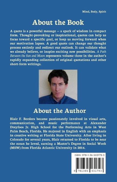 A quote is a powerful message - a spark of wisdom in compact form. Thought-provoking or inspirational, quotes can help us focus toward a specific goal, or keep us moving forward when our motivation lapses. A good quote can change our thought process entirely and redirect our outlook. It can validate what we already believe, or inspire exciting new possibilities. A Path Between the Sun and Moon represents volume three in the author's rapidly expanding collection of original quotations and other short-form writings.