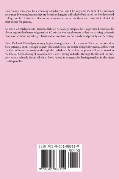 Two friends, torn apart by a scheming outsider. Paul and Christalyn are the best of friends from the outset. However, because they are friends so long, it's difficult for Paul to tell her he's developed feelings for her. Christalyn doesn't see a romantic future for them and takes their close-knit relationship for granted. So, when Christalyn meets Harrison Blake on her college campus, she is captivated by his worldly charm. Against her better judgement as a Christian woman, she starts to date the dashing, debonair counselor, with full knowledge Harrison does not share her faith and could possibly lead her astray. Then, Paul and Christalyn's journey begins through the eye of the storm. There seems no end to their torrential stint. Through tragedy, loss and distress, the couple emerges invincible, as they trust the God of heaven to navigate through the turbulence. It depicts the power of love, as stated in the biblical book of Song of Solomon 8:6, "Love is strong as death." Through the fire and the rain, they learn a valuable lesson, which is, love's reward is sweeter, after having partaken in the bitter hardships of life.