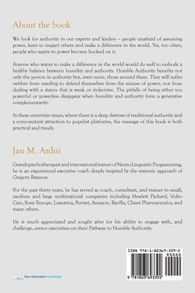 About the book. We look for authority in our experts and leaders - people unafraid of assuming power, keen to impact others and make a difference in the world. Yet, too often, people who aspire to power become hooked on it. Anyone who wants to make a difference in the world would do well to embody a healthy balance between humility and authority. Humble Authority benefits not only the person in authority but, even more, those around them. They will suffer neither from needing to defend themselves from the misuse of power, nor from dealing with a stance that is weak or indecisive. The pitfalls of being either too powerful or powerless disappear when humility and authority form a generative complementarity. In these uncertain times, where there is a deep distrust of traditional authority and a concomitant attraction to populist platforms, the message of this book is both practical and timely. Jan M. Ardui. Gestalt psychotherapist and international trainer of Neuro-Linguistic Programming, he is an experienced executive coach deeply inspired by the systemic approach of Gregory Bateson. For the past thirty years, he has served as coach, consultant, and trainer in small, medium and large multinational companies including Hewlett Packard, Volvo Cars, Sony Europe, Luxottica, Ferrari, Amazon, Barilla, Chiesi Pharmaceutics, and many others. He is much appreciated and sought after for his ability to engage with, and challenge, senior executives on their Pathway to Humble Authority.