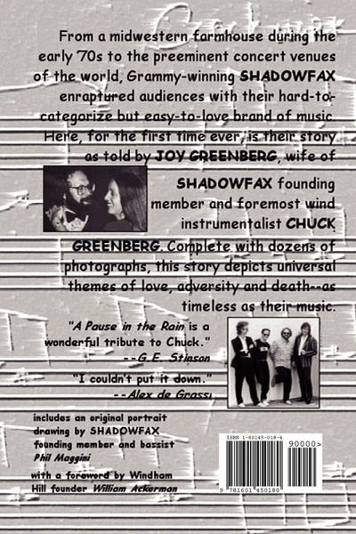 A Pause in the Rain is a memoir about the author's late husband, Chuck Greenberg, who was a founding member of Grammy Award-winning music pioneers Shadowfax.