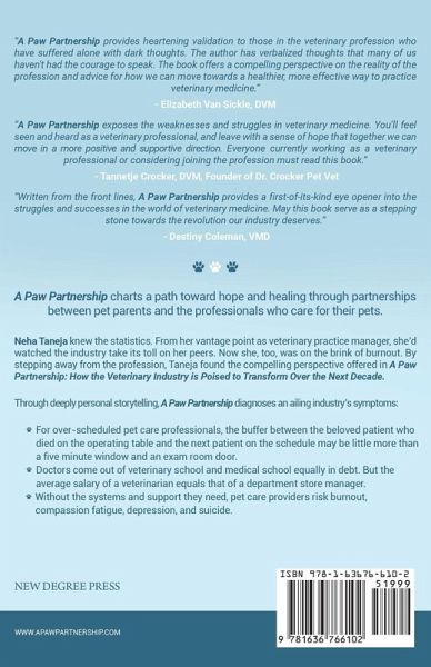 A Paw Partnership charts a path toward hope and healing through partnerships between pet parents and the professionals who care for their pets. Neha Taneja knew the statistics. From her vantage point as veterinary practice manager, she'd watched the industry take its toll on her peers. Now she, too, was on the brink of burnout. By stepping away from the profession, Taneja found the compelling perspective offered in A Paw Partnership: How the Veterinary Industry is Poised to Transform Over the Next Decade. Through deeply personal storytelling, A Paw Partnership diagnoses an ailing industry's symptoms:For over-scheduled pet care professionals, the buffer between the beloved patient who died on the operating table and the next patient on the schedule may be little more than a five minute window and an exam room door. Doctors come out of veterinary school and medical school equally in debt. But the average salary of a veterinarian equals that of a department store manager. Without the systems and support they need, pet care providers risk burnout, compassion fatigue, depression, and suicide.