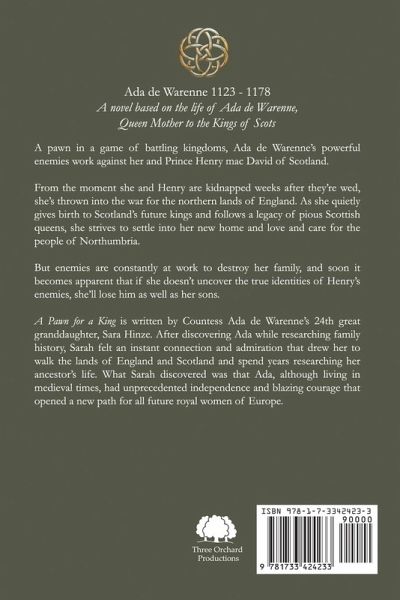 A pawn in a game of battling kingdoms, Ada de Warenne's powerful enemies work against her and Prince Henry mac David of Scotland. From the moment she and Henry are kidnapped weeks after they're wed, she's thrown into the war for the northern lands of England. As she quietly gives birth to Scotland's future kings and follows a legacy of pious Scottish queens, she strives to settle into her new home and love and care for the people of Northumbria. But enemies are constantly at work to destroy her family, and soon it becomes apparent that if she doesn't uncover the true identities of Henry's enemies, she'll lose him as well as her sons. A Pawn for a King is written by Countess Ada de Warenne's 24th great granddaughter, Sara Hinze. After discovering Ada while researching family history, Sarah felt an instant connection and admiration that drew her to walk the lands of England and Scotland and spend years researching her ancestor's life. What Sarah discovered was that Ada, although living in medieval times, had unprecedented independence and blazing courage that opened a new path for all future royal women of Europe.